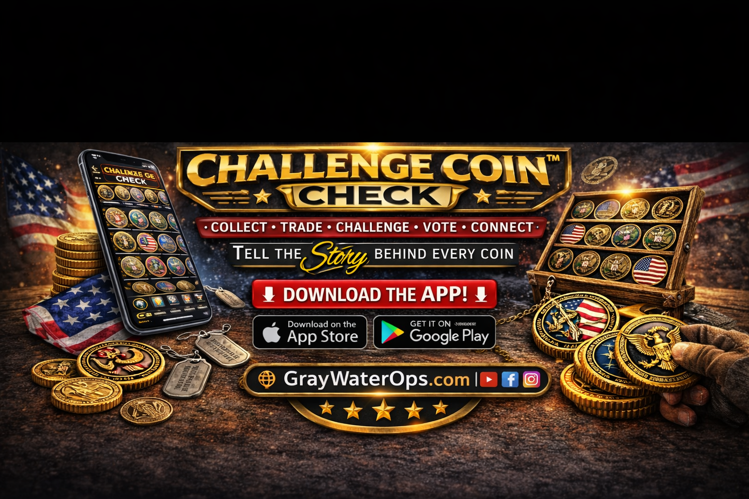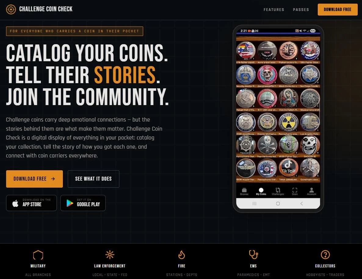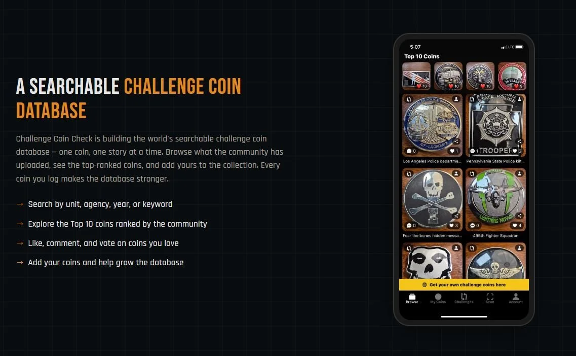 The Challenge Coin Challenge app is a new social app just for coin carrying members. Each challenge coin tells a story and has strong emotional connection between the the person who carries it and the bigger organization that they’re part of. They’re about belonging. This new app is building a challenge coin database that will allow those who carry, to contribute their coins and the story behind it. The app has a browse page which is the feed of all of the new challenge coins added to the database. On any coin image, you can tap it to open up a front and back image of the coin along with any metadata the uploader included. It’s a way to get a behind the scenes look at the story behind the challenge coins. You can like or comment on coins and challenge up to 3 per day, against one of the coins from your own display. The next tab is your my-coins page that shows any of your own challenge coins that you’ve added to your digital display. Imagine carrying all of your challenge coins with you digitally? The Challenge page is all the live 24 hour challenges between 2 different coins. Simple concept. Vote for the one you like best. The top of the browse page also has your top 10 coins liked. scroll through and open any coin to see the data and images. A cool feature I really like is if you like a coin on the browse page, you can click the person icon in the top right corner and go see all of the challenge coins in their own displays! Show off your challenge coins to anyone! The next tab is the scan-coin tab where you can add your own coins to your digital coin display. The last tab is your account page that shows if you’re a free member just browsing and liking coins or if you have a collector’s Pass to show off your own coins and challenge others!